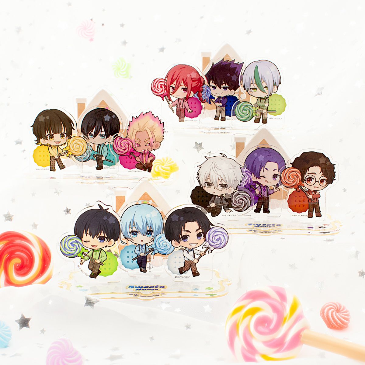 蜂楽 廻&糸師 凛&士道龍聖デザインのアクリルジオラマスタンドです。お菓子のおうちは3人のキャラクターカラー仕様。ポップでスイートなデザインがかわいい!