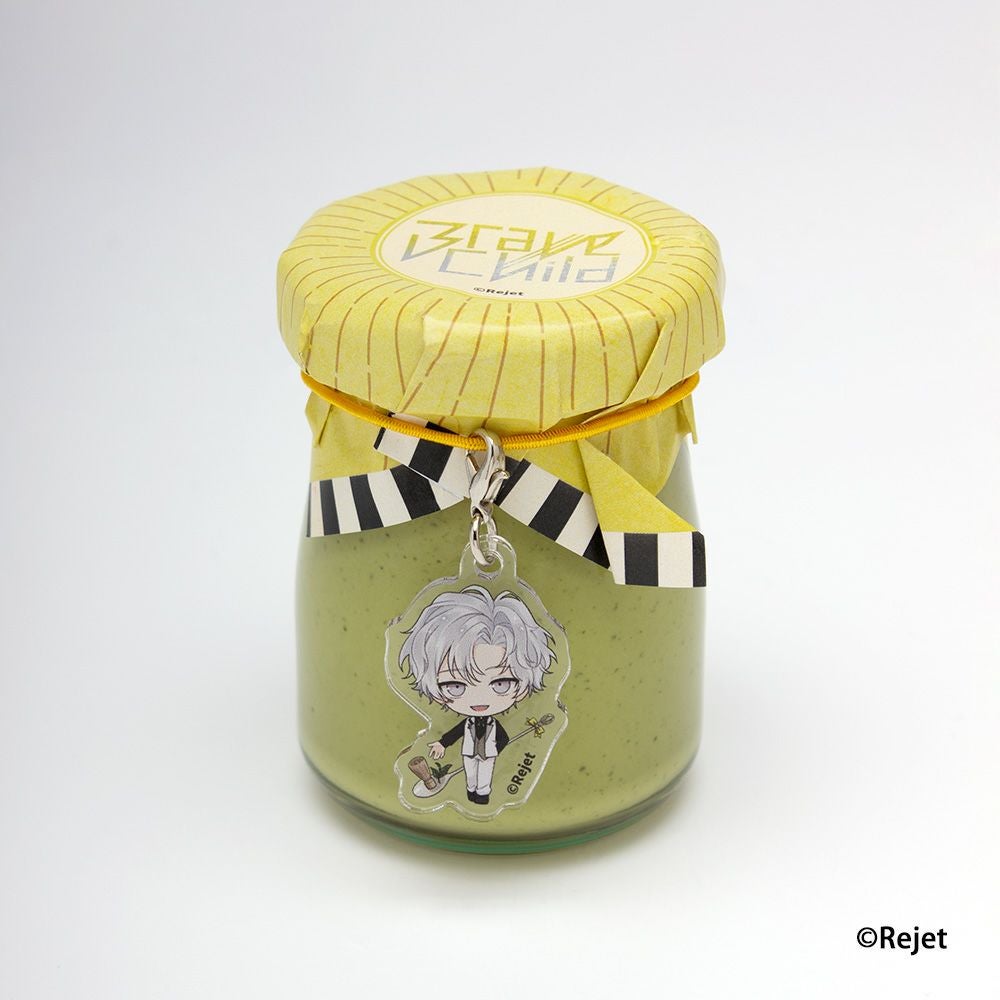 ヨシュアが選ぶ、抹茶味のコラボプリンです。パッケージに付いたミニキャラアクリルチャームは、プリンを食べ終わった後取り外し、好きなところに付けられます!