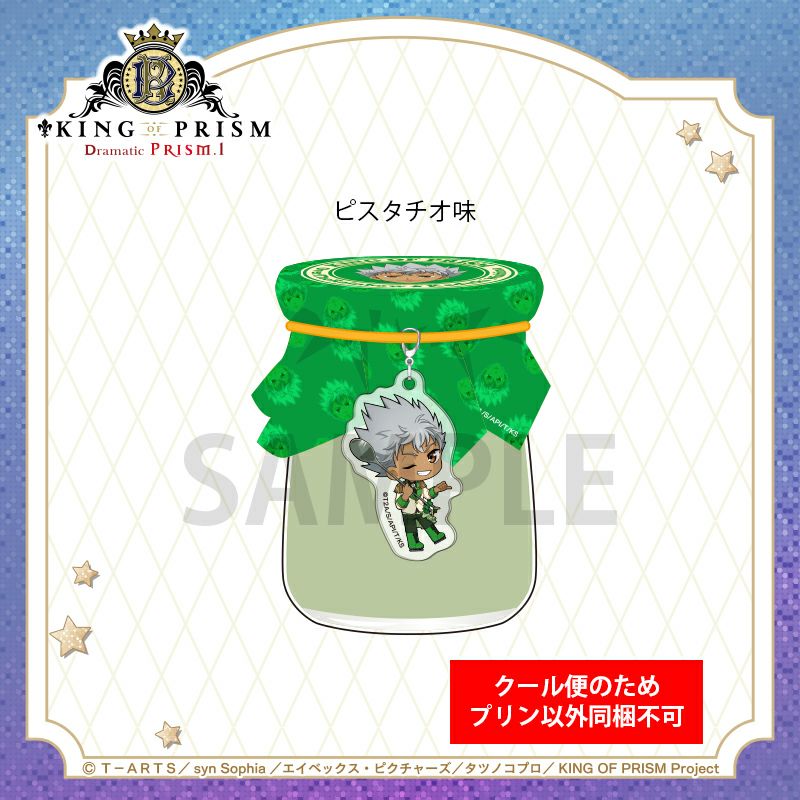 仁科カヅキコラボパッケージのオリジナルプリン(ピスタチオ味)です。パッケージに付いたミニキャラアクリルチャームは、取り外してお好きなところに付けることもできます!ミニキャラの衣装ともリンクしたフレーバーのプリンをぜひお楽しみください。