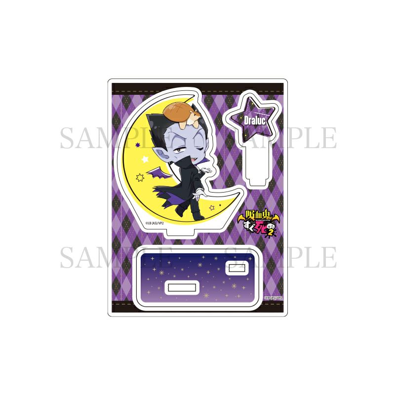 「吸血鬼すぐ死ぬ2」より、描き起こしミニキャラを使用したオリジナルデザインのアクリルスタンドが登場です。大きな三日月の前に佇むドラルクとジョン。各キャラクターたちのモチーフをワンポイントに配しました。同じシリーズにはキャラクター違い(別売り)もあります。