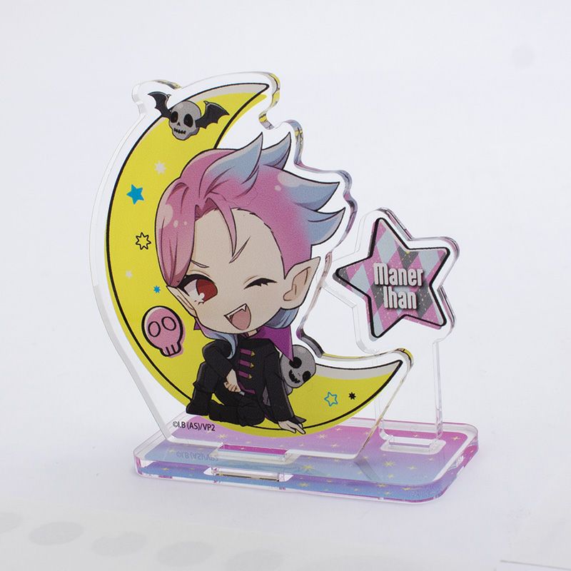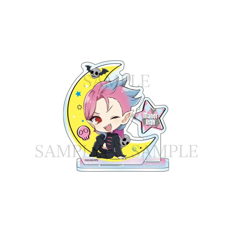 「吸血鬼すぐ死ぬ2」より、描き起こしミニキャラを使用したオリジナルデザインのアクリルスタンドが登場です。大きな三日月の前に佇むマナー違反。みんなが立っている中ひとりだけ座ってしまっているのは、彼なりのマナー違反でしょうか?各キャラクターたちのモチーフをワンポイントに配しました。同じシリーズにはキャラクター違い(別売り)もあります。