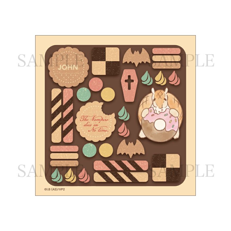 クッキーに囲まれたジョンのミニタオルが登場です。タオル全面をクッキー缶に見立てたデザイン。お菓子を頬張るジョンの愛らしさと、ちりばめられた吸血鬼モチーフのクッキーがポイント。