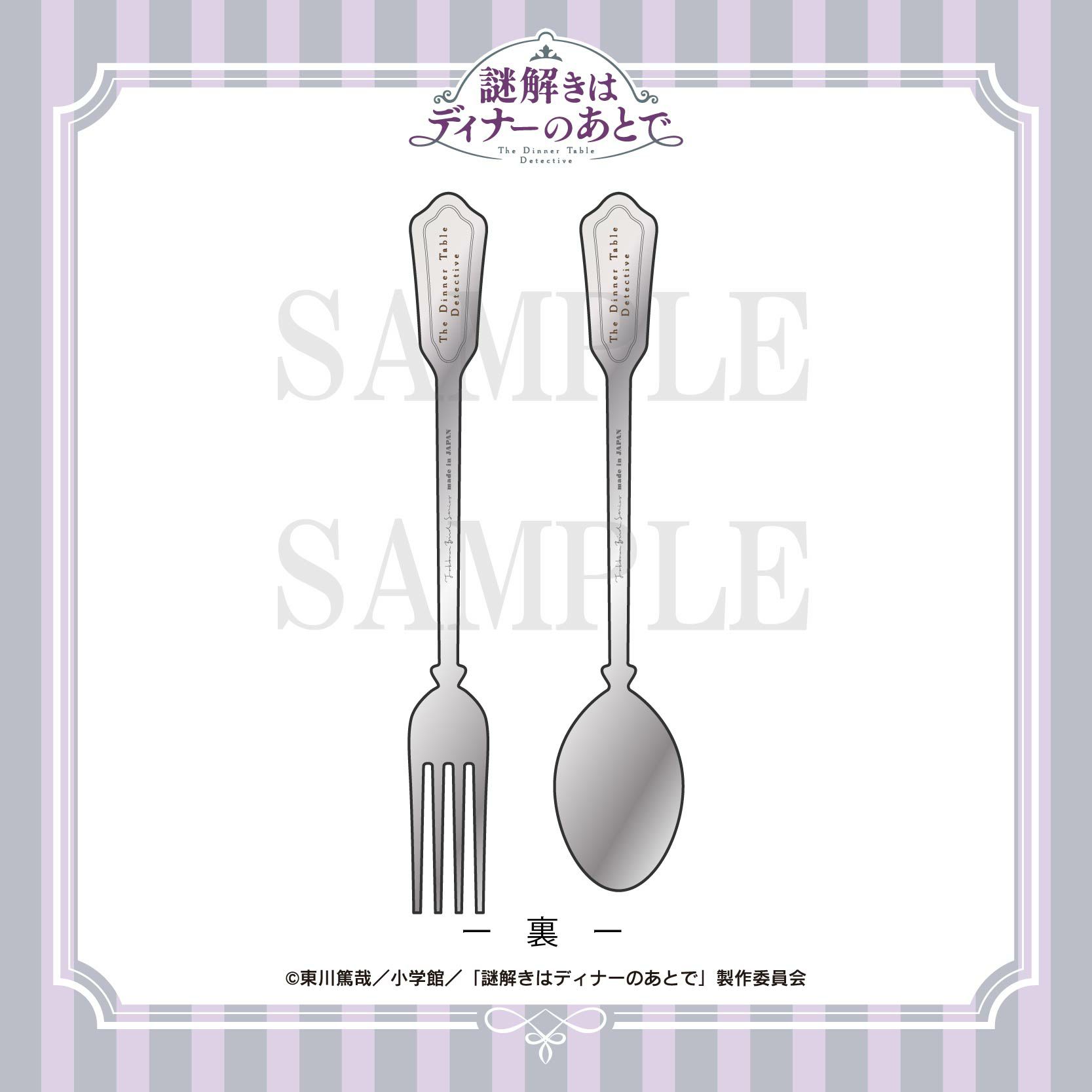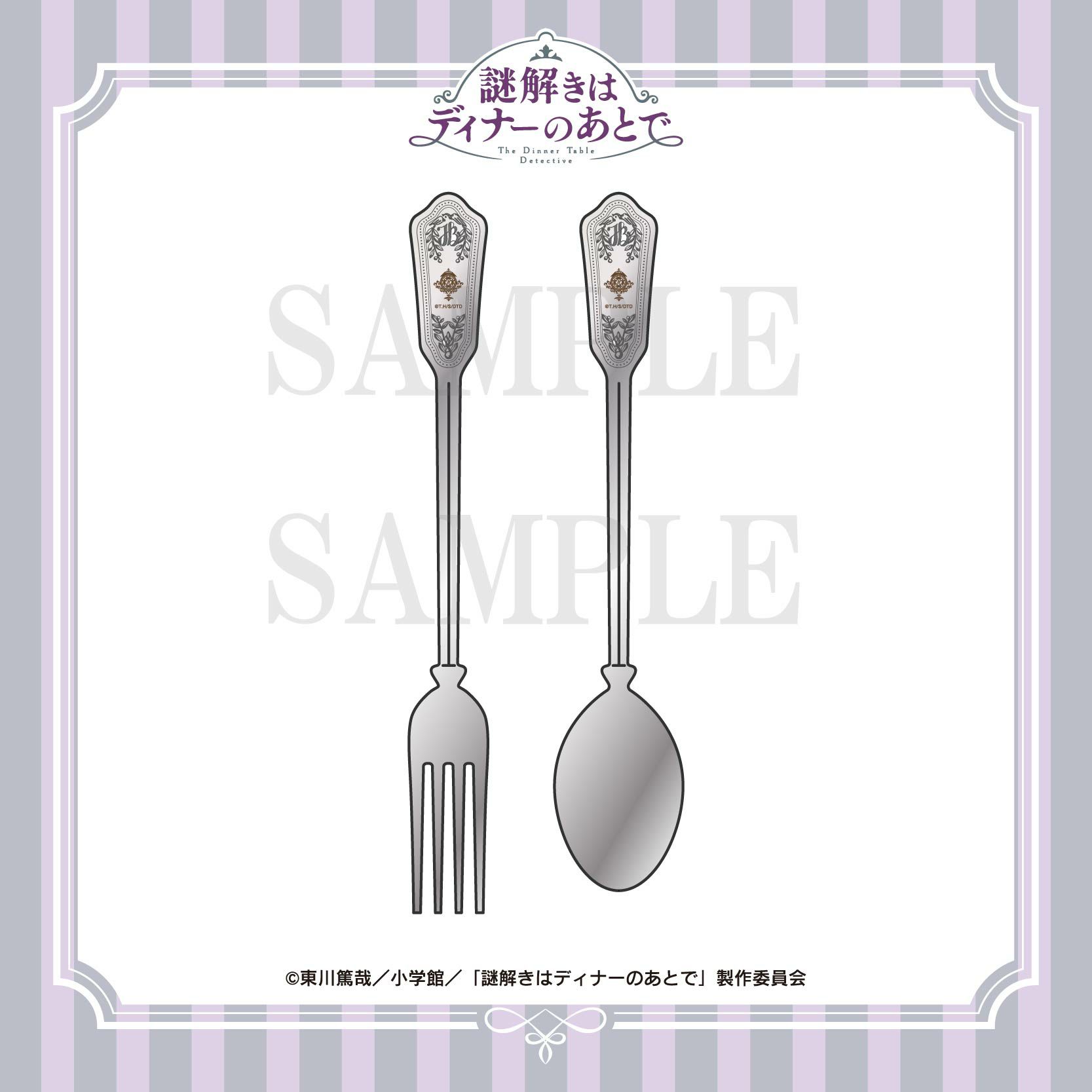 宝生家の家紋が刻印されたディナーフォーク・ディナースプーンのカトラリーセットです。謎解き前のディナータイムにご使用ください……♪