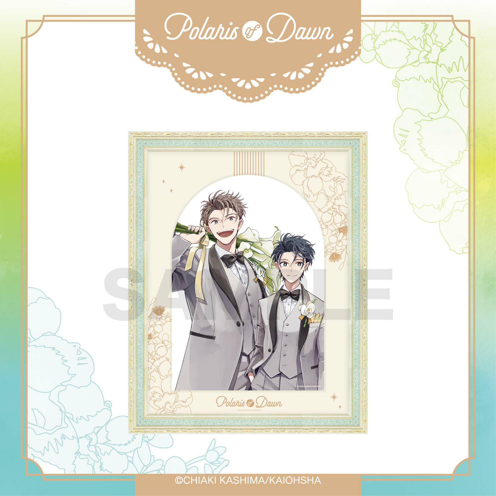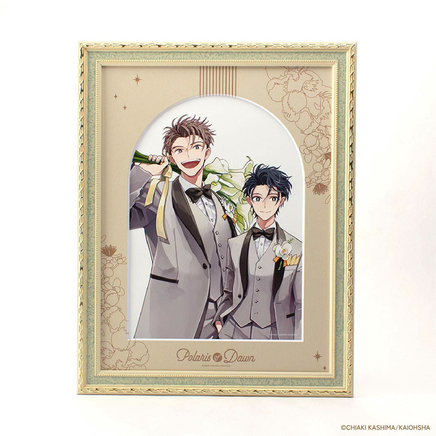 12色インクのプリンターを用いて制作した、高精細の複製画です。額縁に入れ、作品証明書にシリアルナンバーを記載してお届けします。ジューンブライドをイメージしたタキシード衣装の2人に合う、淡い色合いのマットとフレームで落ち着いたデザインに仕上げました。