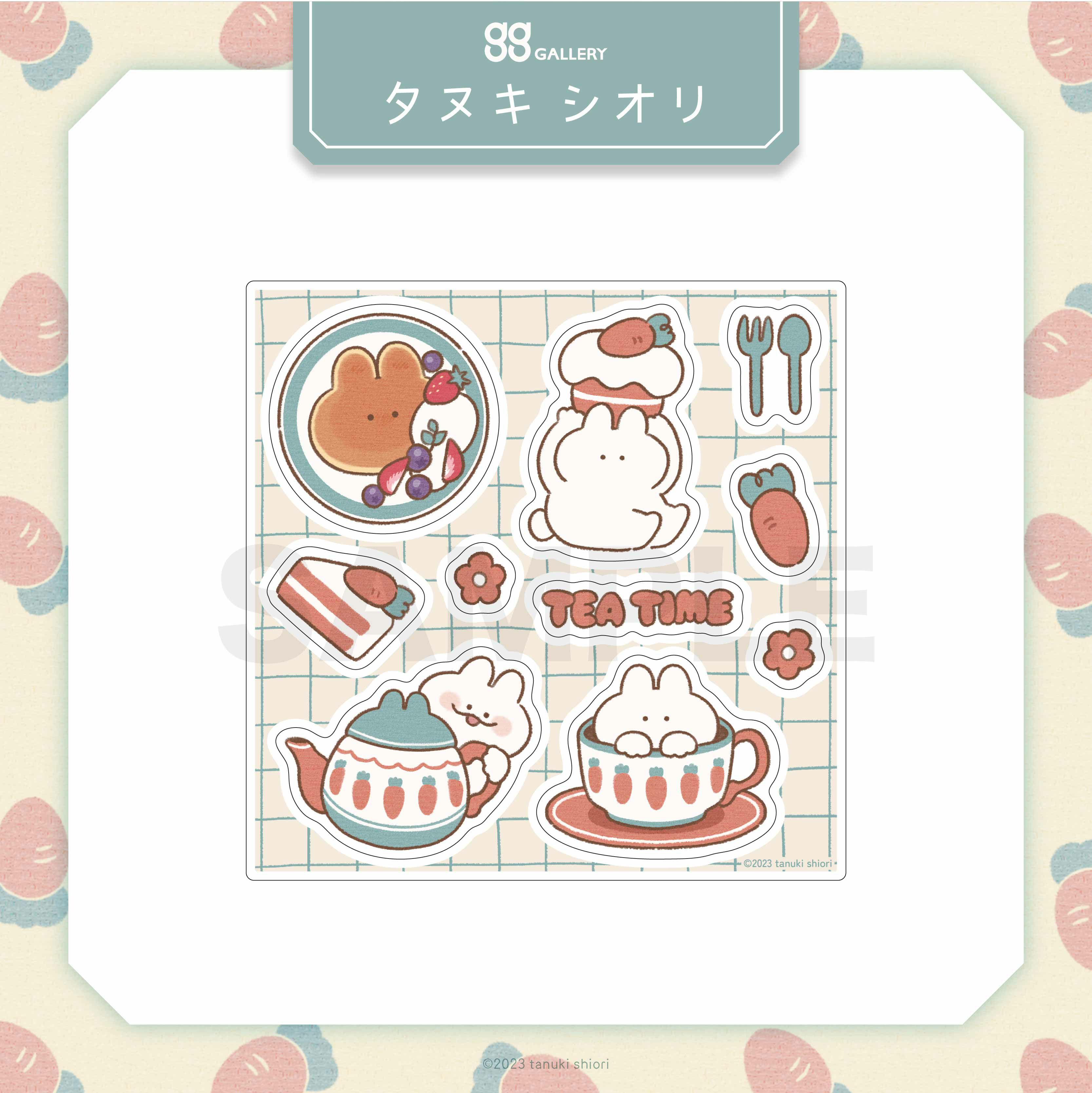 ゆるっと優しい雰囲気の絵を描くイラストレーター・タヌキシオリさんのうさぎの「ぽて」がステッカーに!パンケーキやティーポットなど、ティータイムがテーマの可愛らしいデザインです。