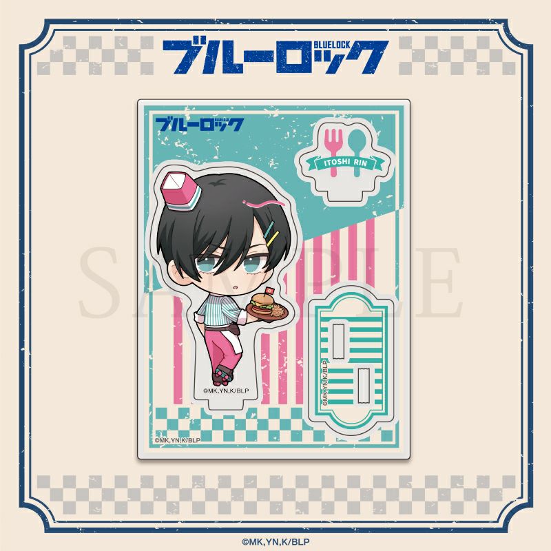アメリカンダイナー衣装の糸師 凛のミニキャラアクリルスタンドです。ちょっぴりレトロでポップなデザインがカワイイ!板のままでも組み立てて飾っても可愛いデザインです。
