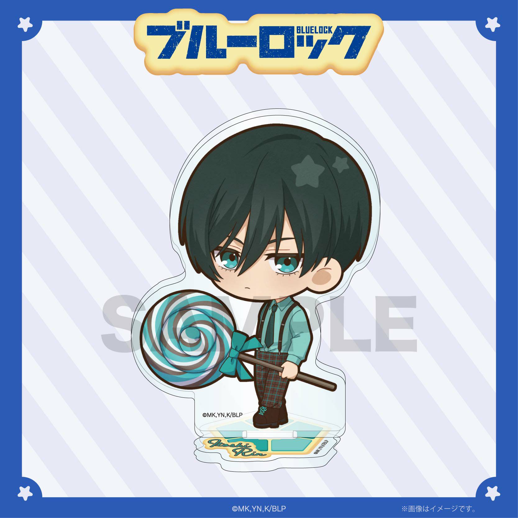 大きなキャンディを持った糸師 凛のミニキャラアクリルスタンドです。ポップでスイートなデザインがかわいい!板のままでも組み立てて飾っても可愛いデザインです。