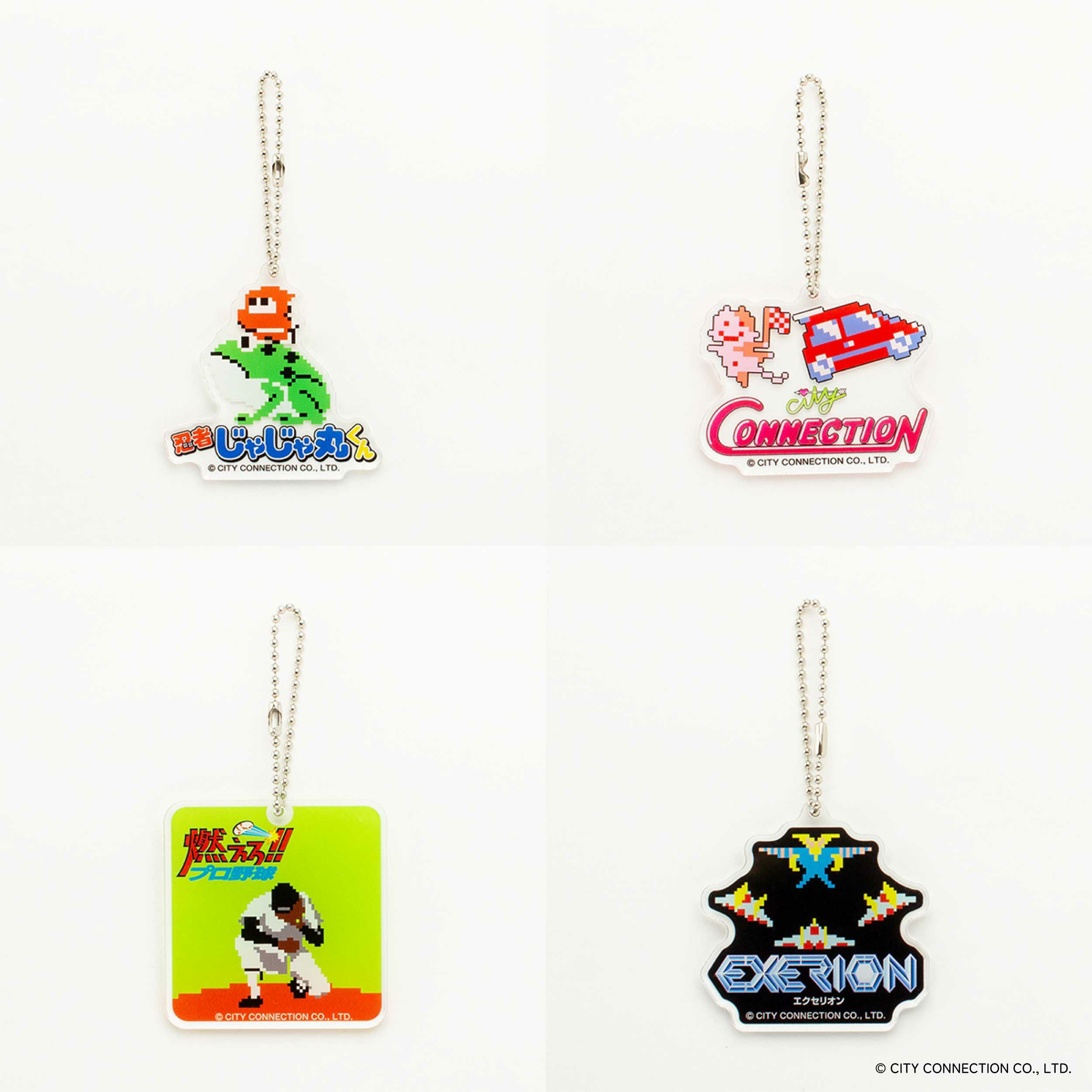数あるJALECO名作ソフトの中でも特に人気の高い「忍者じゃじゃ丸くん」「シティコネクション」「燃えろ!!プロ野球」「エクセリオン」からキャラクターや印象的なシーンをドット絵表現そのままに再現したアクリルキーホルダーです。