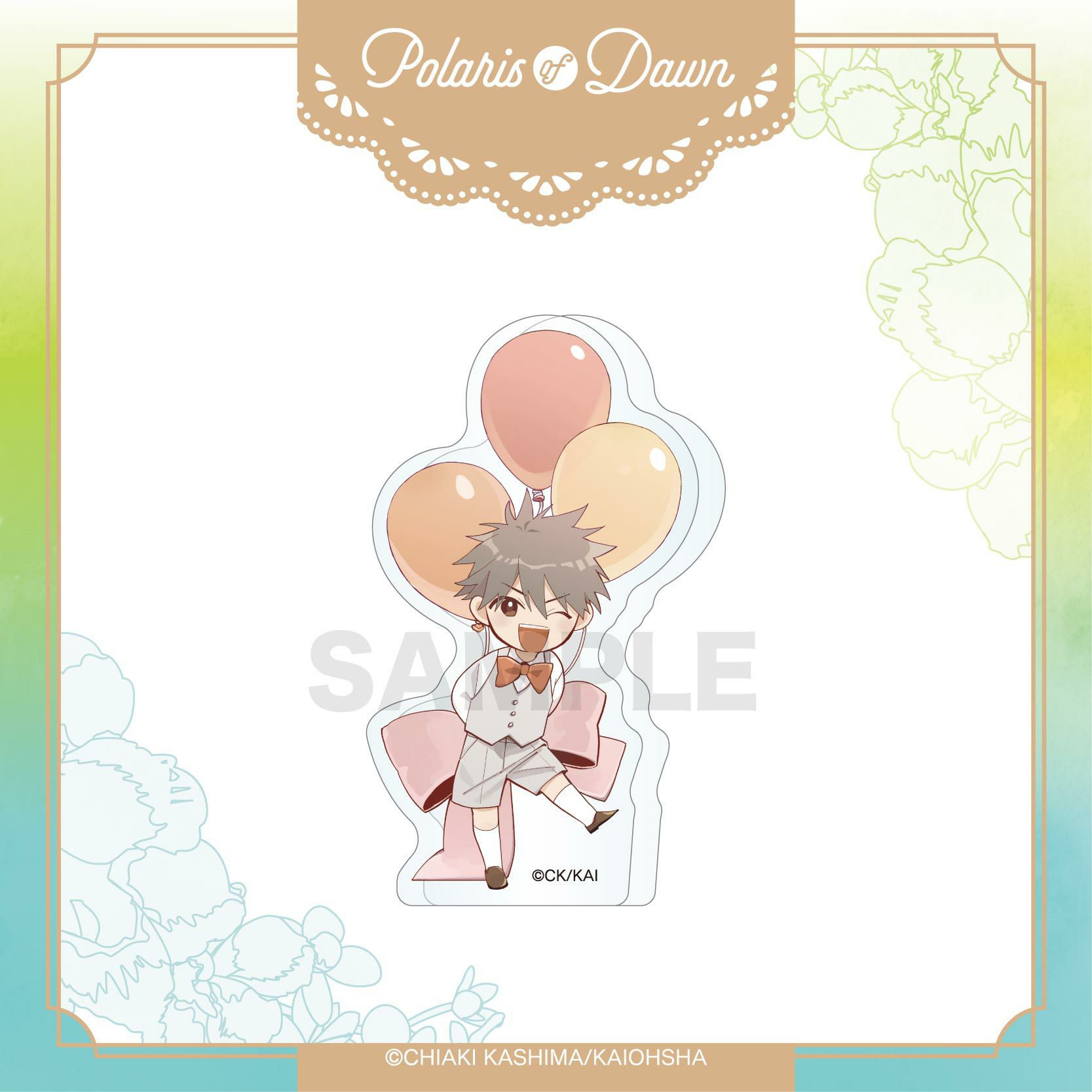 「夜明けのポラリス」より、嘉島ちあき先生描き下ろしのミニキャライラストを使用した、8mmの厚みで台座なしで自立するアクリルフィギュアです。