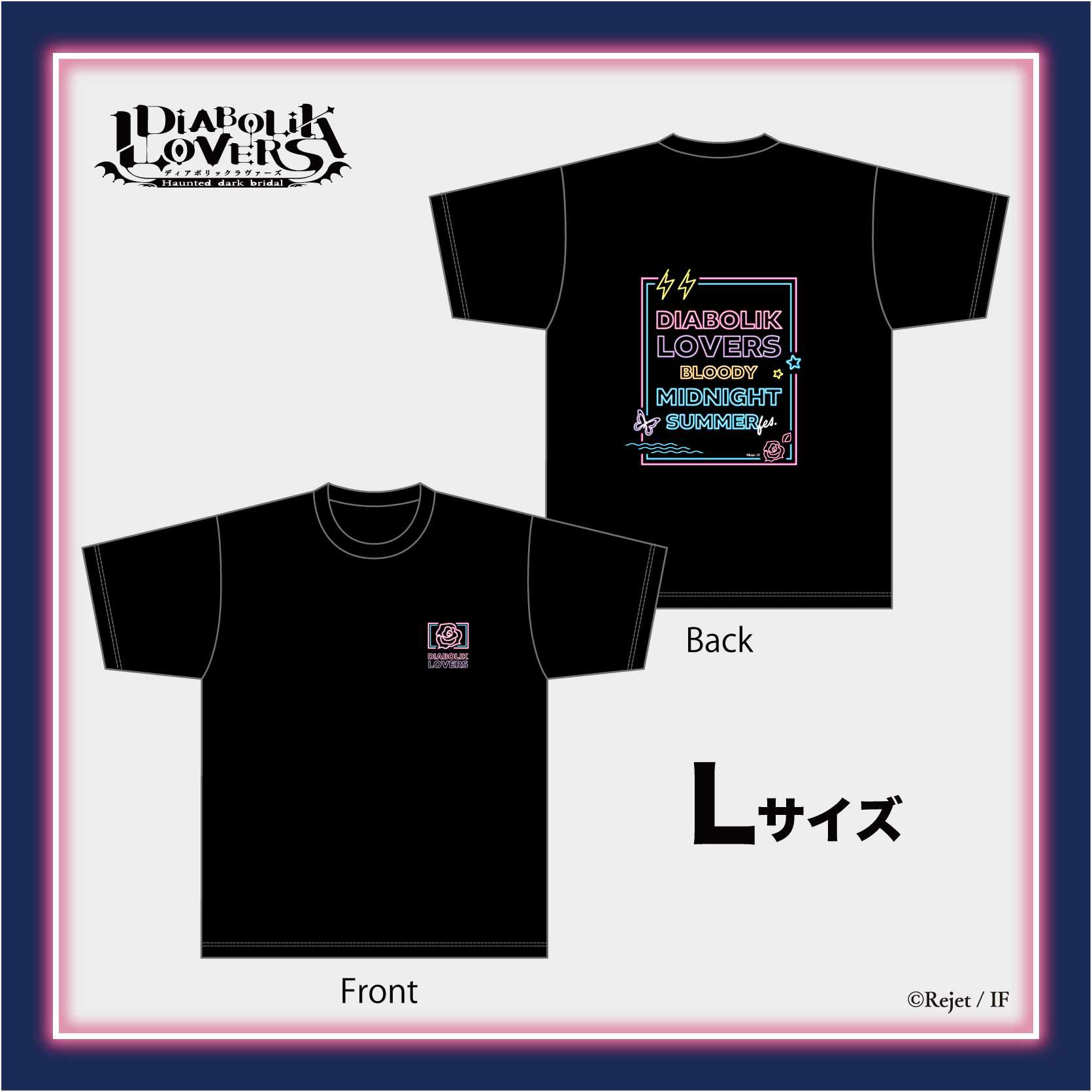 DIABOLIK LOVERS BLOODY MIDNIGHT SUMMER FES.の限定デザインのTシャツです。表にはバラのワンポイント、裏にはイベントのロゴがネオン風にデザインされていて涼しげ!