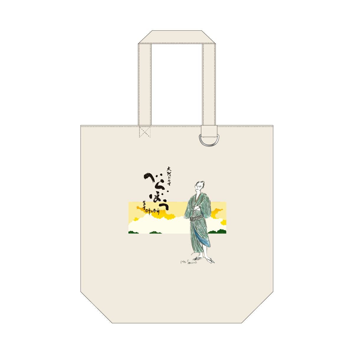 大河ドラマ「べらぼう」ロゴライセンス商品のトートバッグが登場です。「べらぼう」衣装デザイン 伊藤佐智子氏のデザイン画を配したデザインです。キーホルダー用のリングや内ポケット(Wポケット)付きで使いやすさ抜群の商品です。