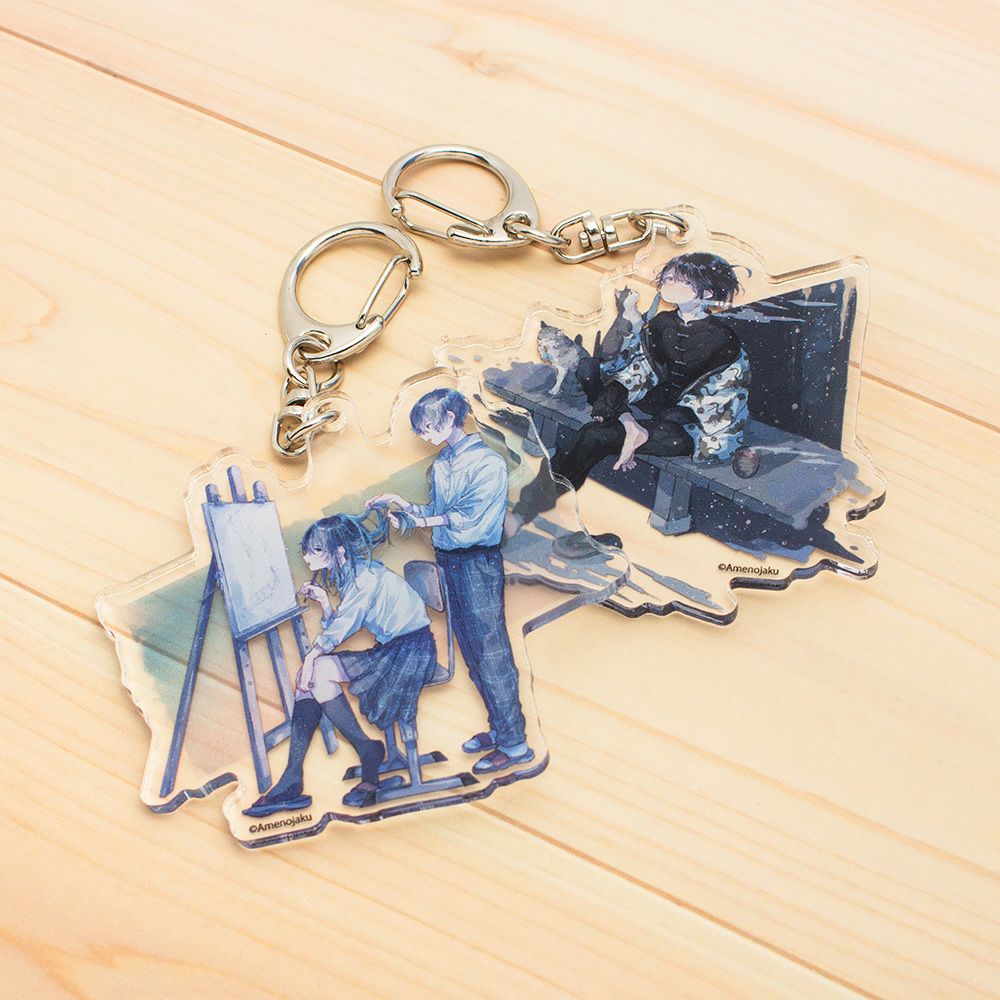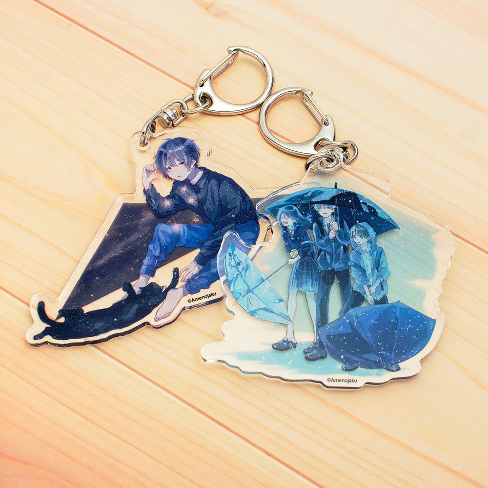 青に癒されるようなイラストを描くイラストレーター あめのじゃくさんのトレーディングアクリルキーホルダーの第二弾です。ポーチやかばんのワンポイントに。