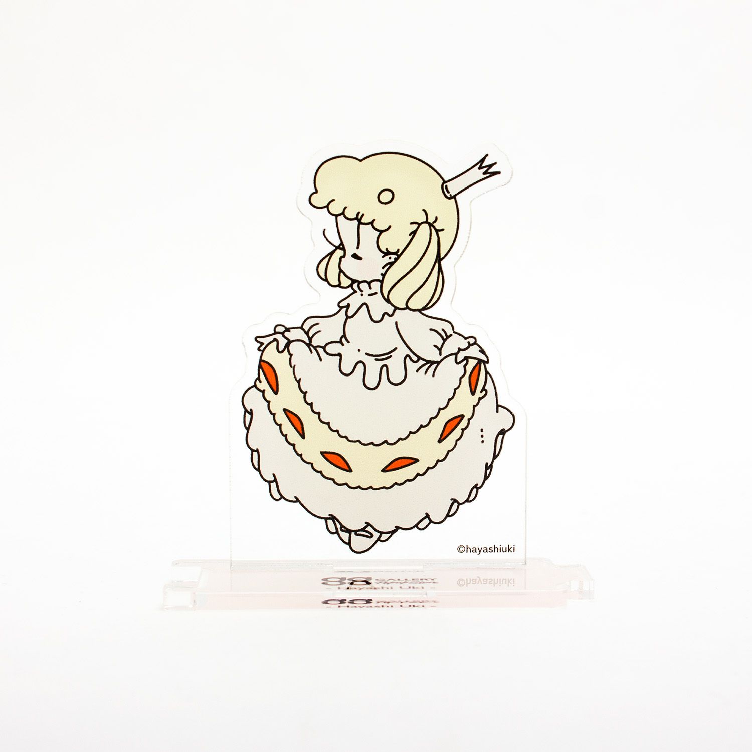 レトロで可愛いイラストを描くイラストレーター はやしうきさんによる、いちごのショートケーキの子のアクリルスタンドが登場。アクリルスタンド同士を台座をつなげて並べることができます。