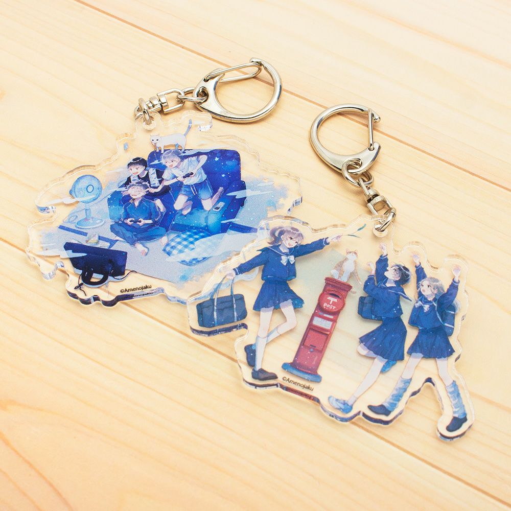 青に癒されるようなイラストを描くイラストレーター あめのじゃくさんのトレーディングアクリルキーホルダーの第二弾です。ポーチやかばんのワンポイントに。