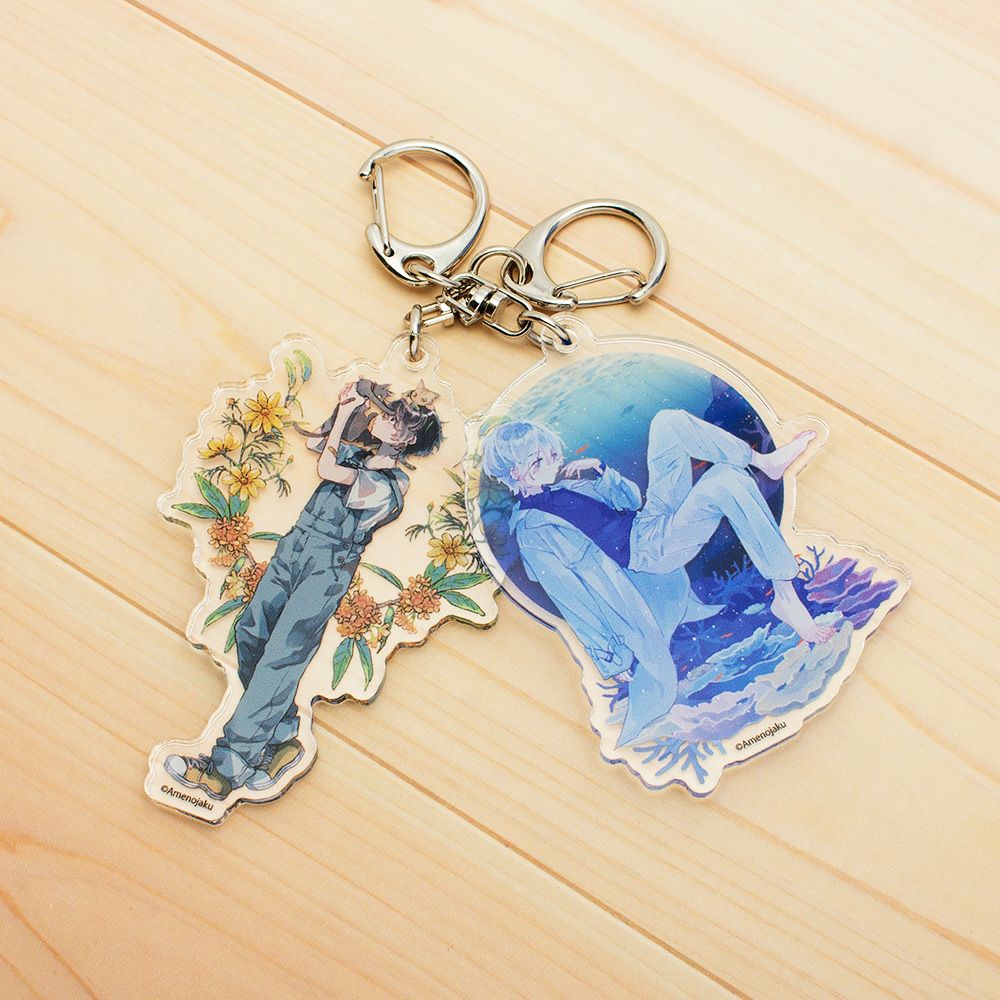 青に癒されるようなイラストを描くイラストレーター あめのじゃくさんのトレーディングアクリルキーホルダーの第二弾です。ポーチやかばんのワンポイントに。