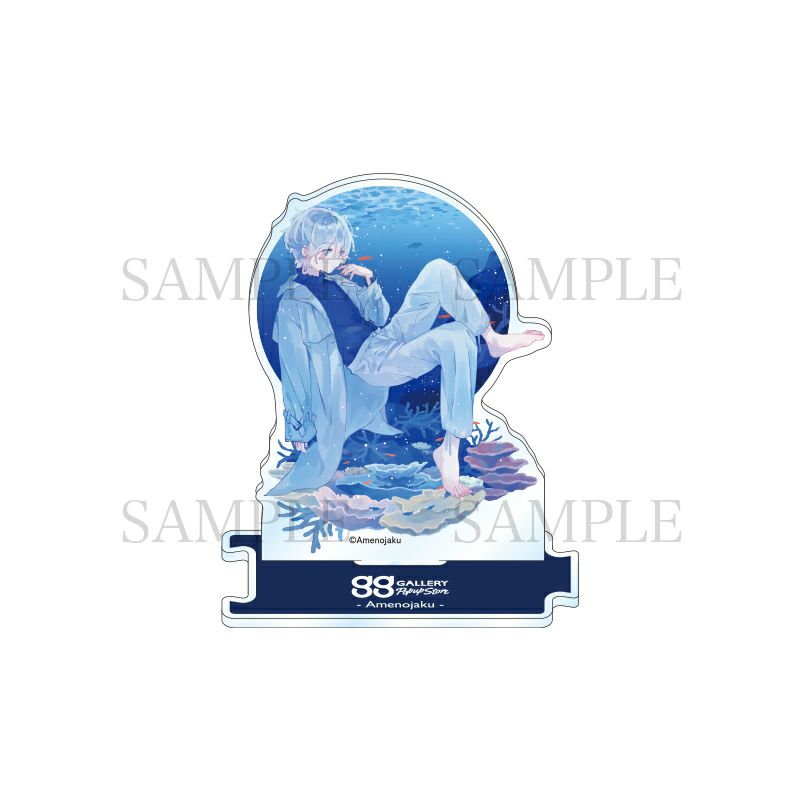 青に癒されるようなイラストを描くイラストレーター あめのじゃくさんの作品をアクリルスタンドに仕上げました。アクリルスタンド同士を台座をつなげて並べることができます。