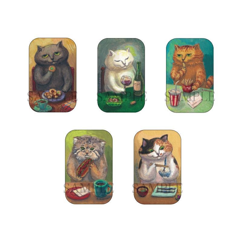 猫や動物をモチーフに日常を描く絵画作家カマノレイコさんの作品から、食べ物とキャラクターたちのかわいいイラストを使用した長方形型の缶バッジ全5種セットです。おしゃれなデザインの台紙にセットしてお届けします。