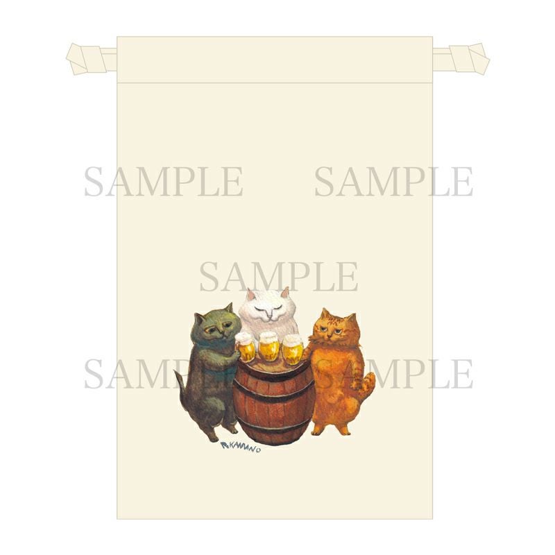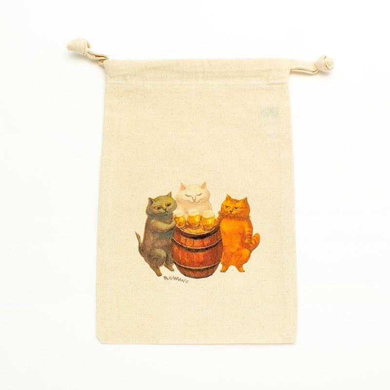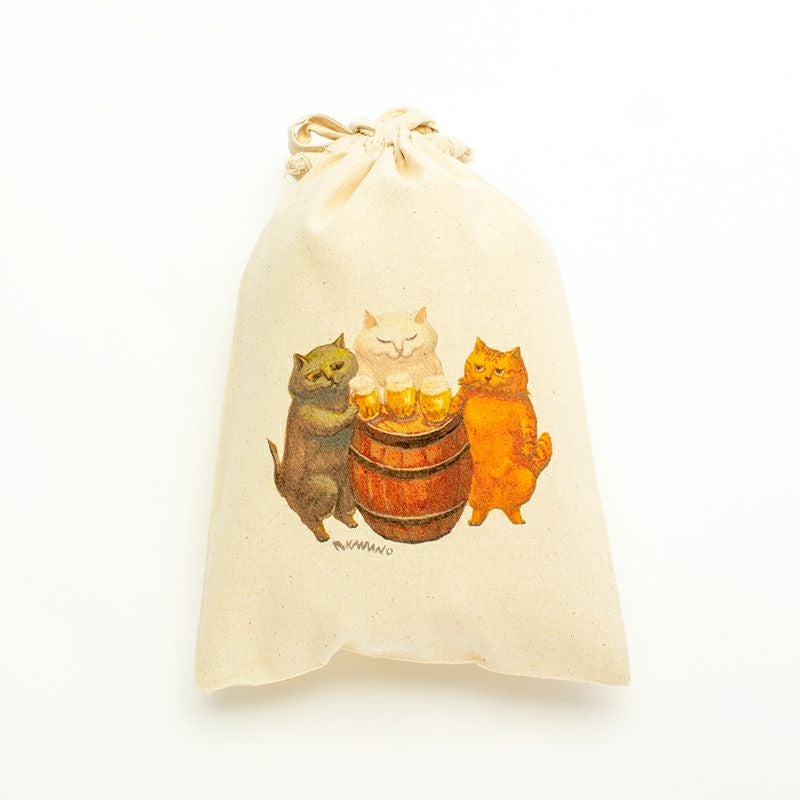 大人気の絵画作家、カマノレイコさんの白猫チャオとちふ、ぐうちゃんが登場する「ビールで乾杯」の巾着袋です。