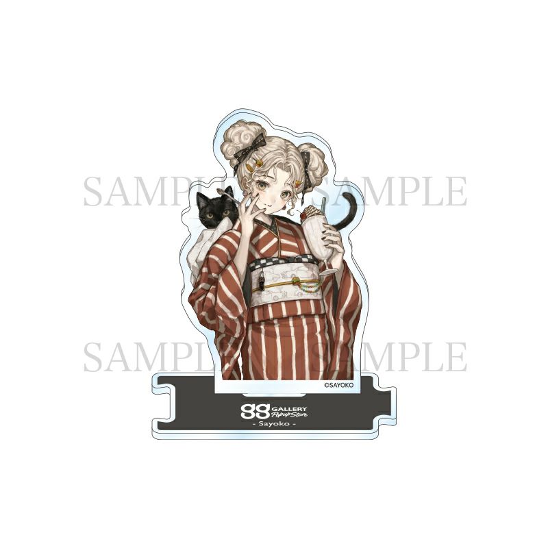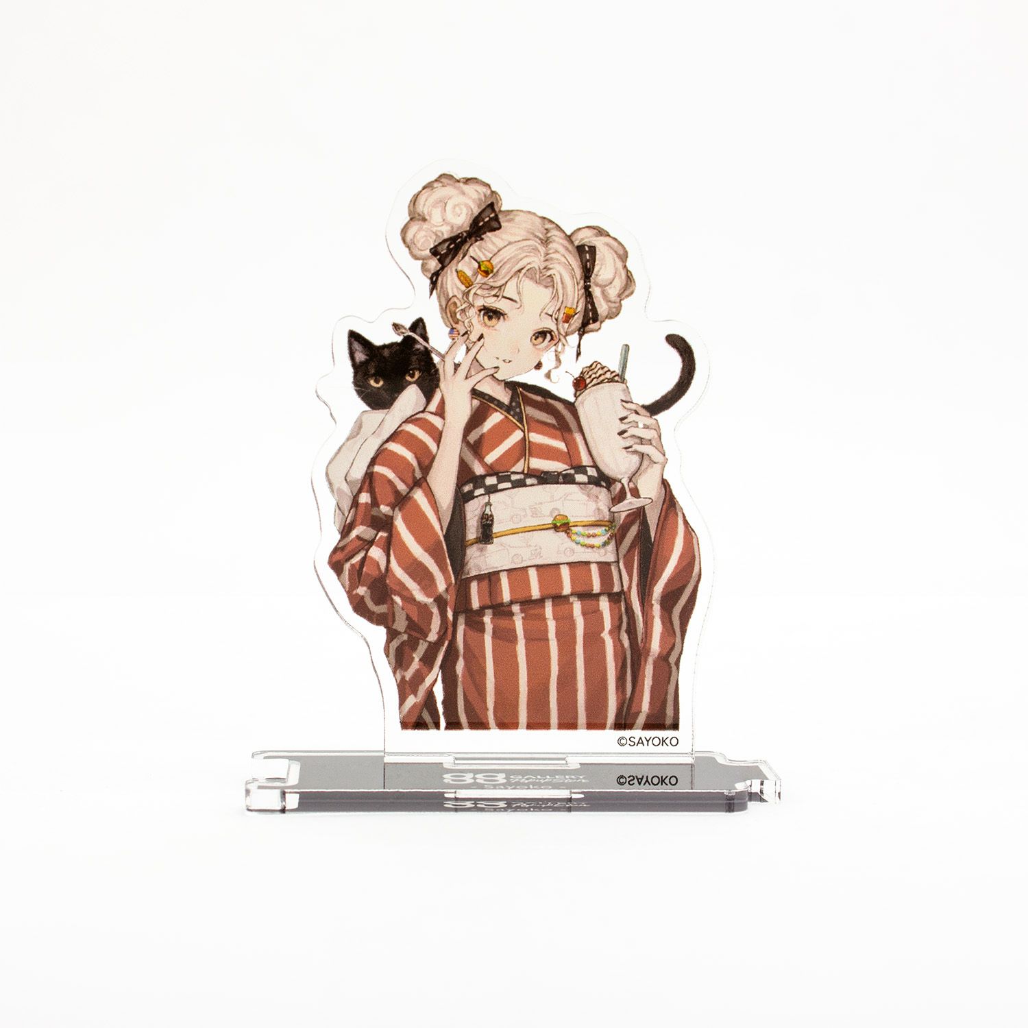 レトロかわいいタッチのイラストを描くイラストレーター 小夜子さんの作品をアクリルスタンドに仕上げました。アクリルスタンド同士を台座をつなげて並べることができます。