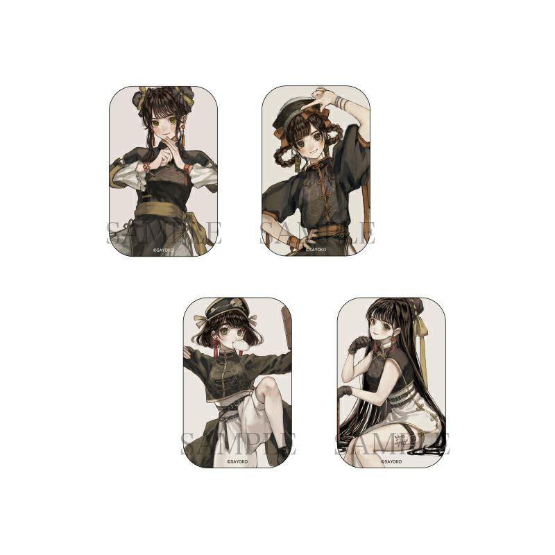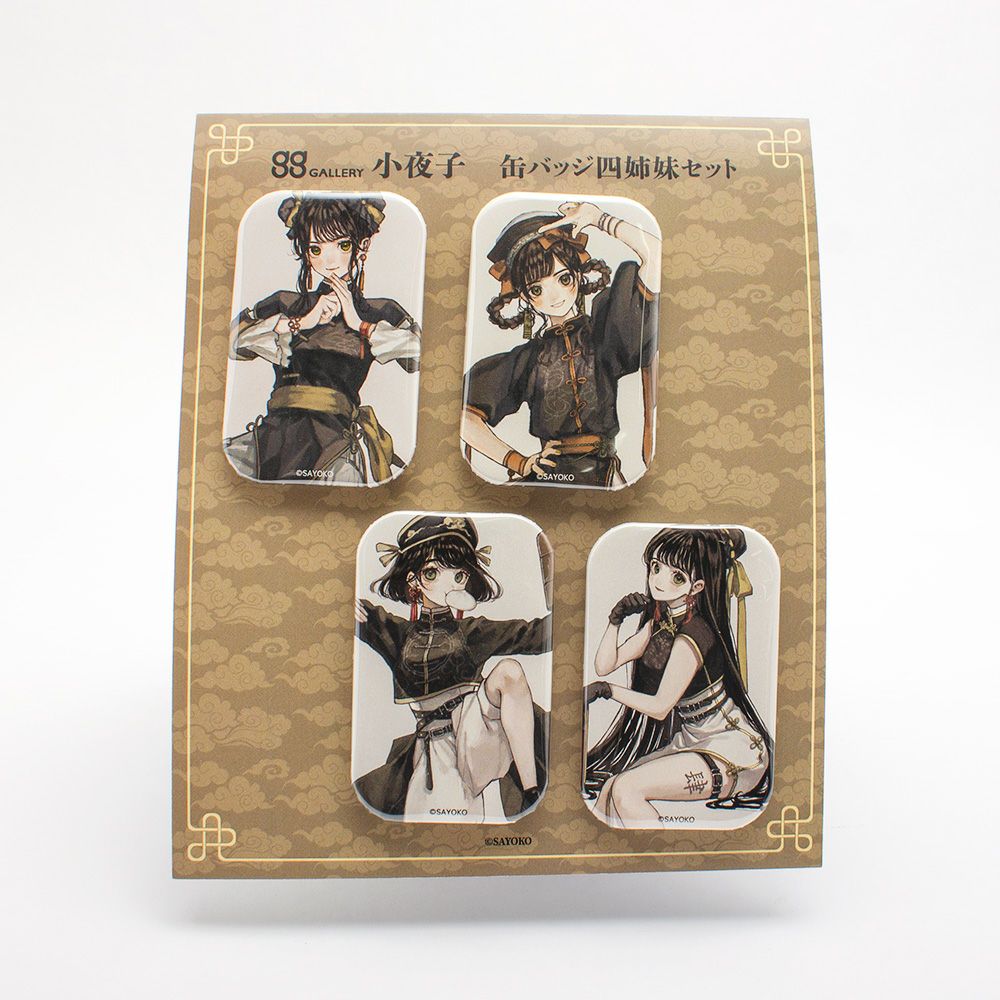 レトロかわいいタッチのイラストを描くイラストレーター 小夜子さんのチャイナ4姉妹の長方形型の缶バッジ全4種セットです。かわいいデザインの台紙にセットしてお届けします。