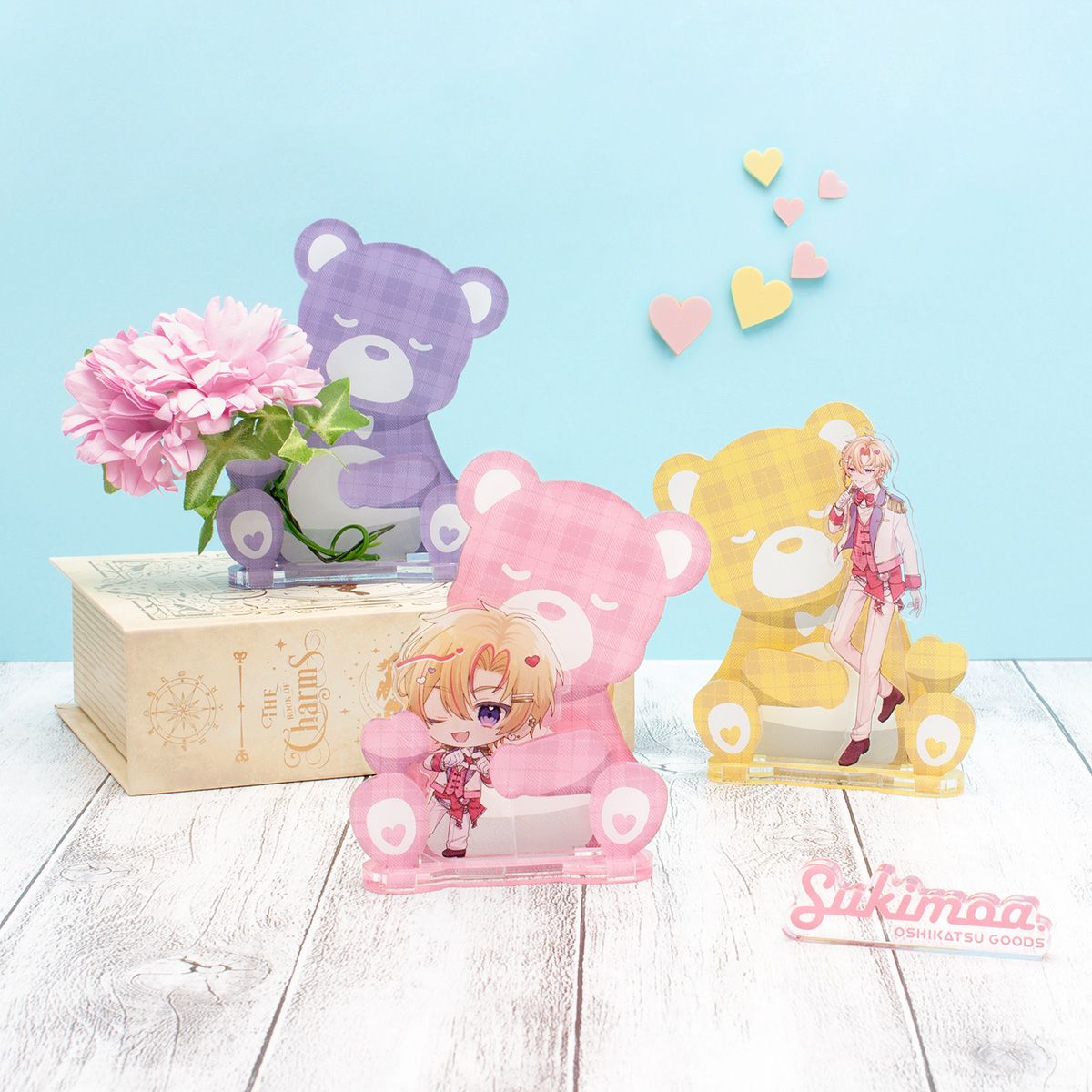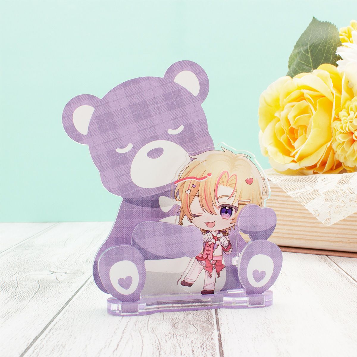 アクリルスタンドやアクリルキーホルダーをセットするとくまちゃんのぬいぐるみが ハグしてくれるように飾ることができるキュートなアイテムです。お菓子やギフトをハグさせると贈り物やインテリアにもぴったり!
