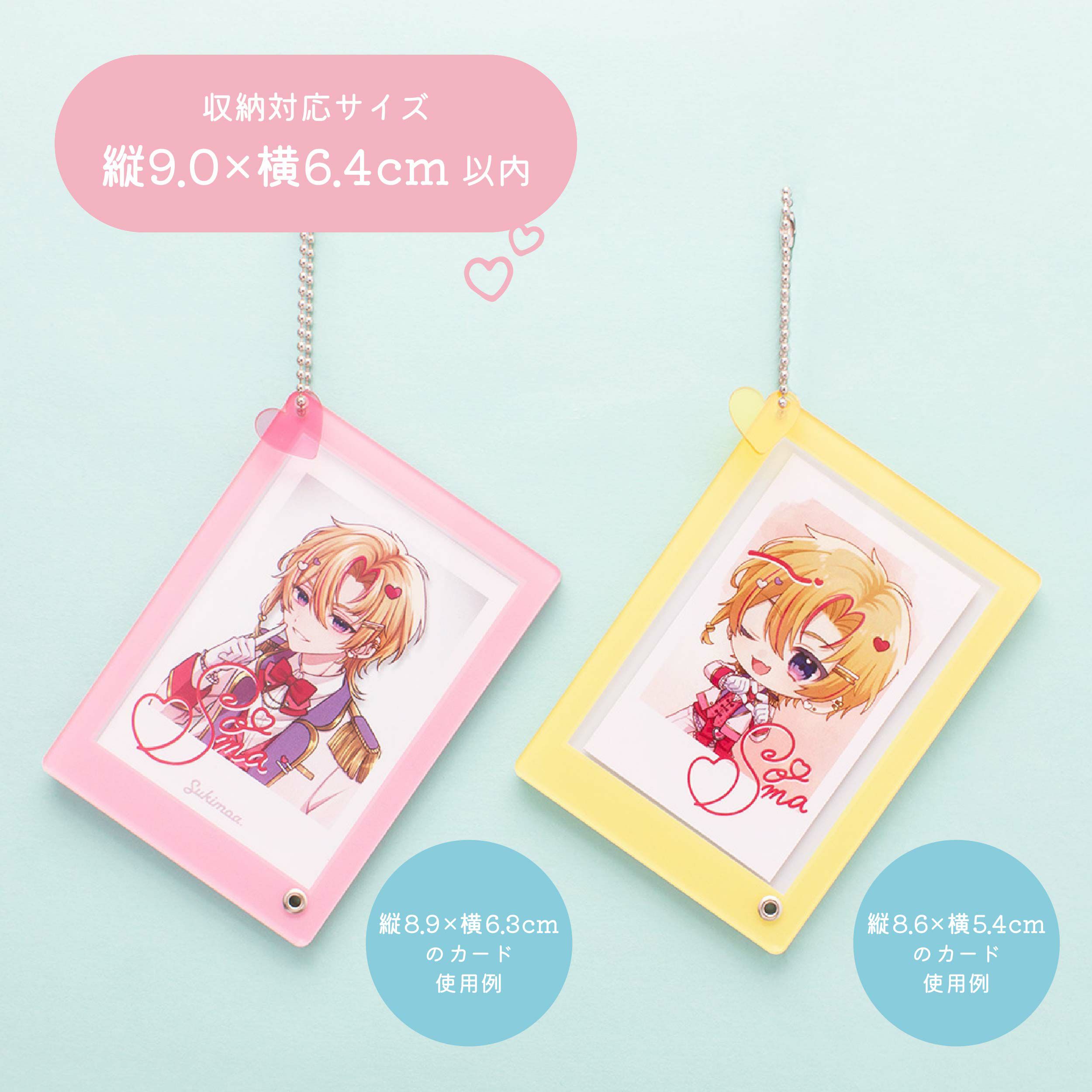 カード系グッズを入れられるアクリルホルダーです。 アクキーやアクスタ、缶バッジまで立てられる万能スタンド付きなので、推しグッズをまとめて飾れます! 小さいクリアハートチャームがワンポイント♡
