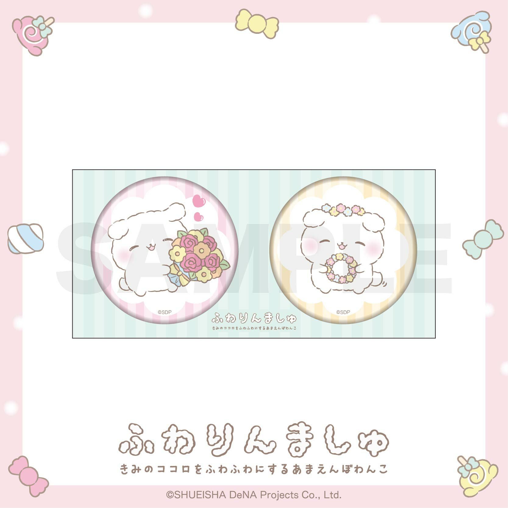 お花に囲まれたふわりんましゅの姿がキュートな缶バッジセットが発売! そのまま飾ったりトートバッグにつけたりするのもおすすめです。
