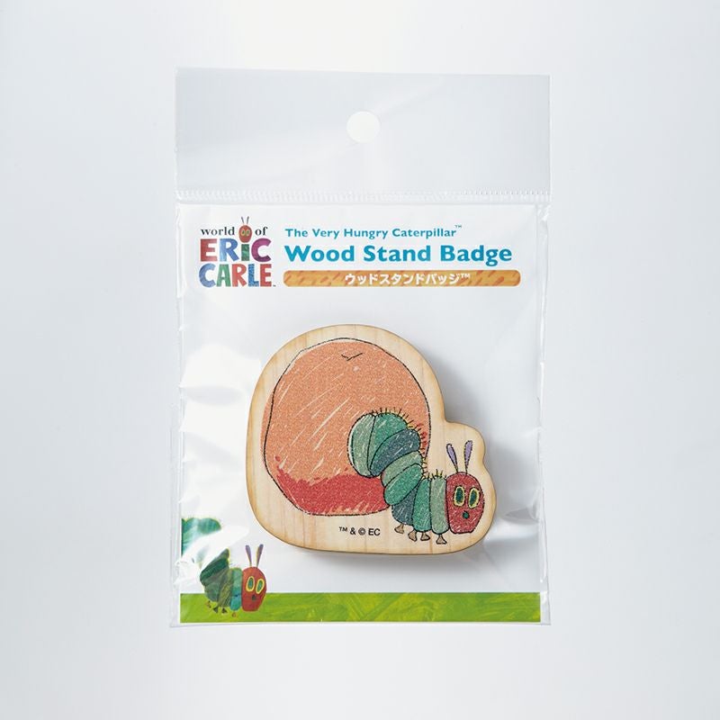 はらぺこあおむしがひょっこりオレンジから出てきたデザインの木製のスタンドバッジです。