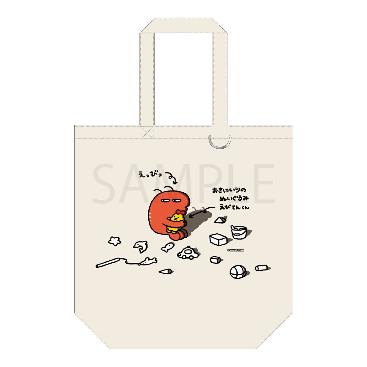 伊豆見香苗さんが描くかわいらしい「えっびっ」のキャラクターのトートバッグが登場です。キーホルダー用のリングや内ポケット(Wポケット)付きで使いやすさ抜群の商品です。